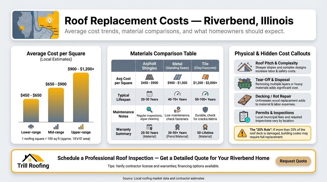 For homeowners in Illinois, particularly within the Riverbend area, understanding the true cost of a roof replacement is the critical first step toward protecting your largest asset. This guide distills the current market trends, material selection consequences, and the lesser-known physical factors that determine your final estimate, helping you move past sticker shock toward an informed investment. You will gain clarity on the average cost per square for local projects, learn how variables like steepness and complexity inflate quotes, and discover which expensive components are often hidden until the tear-off begins. By mastering these elements, you are prepared to vet contractors rigorously and navigate insurance claims confidently, ensuring durability against Illinois’ severe weather patterns. Review the foundational pricing metrics now to build a budget that truly reflects quality and longevity.