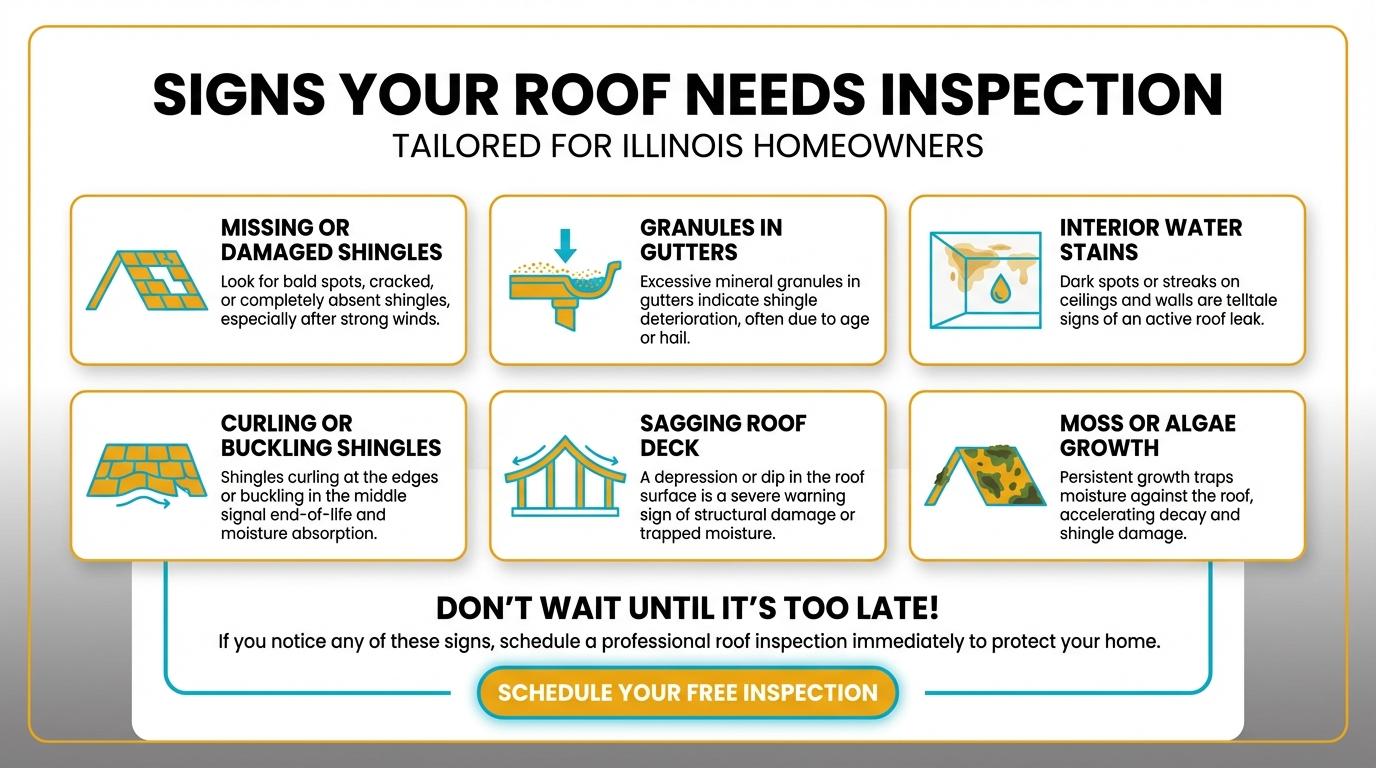 - Missing or Damaged Shingles: High Illinois winds can easily peel back tabs, especially on older roofs.